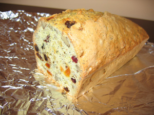 Żółtka utrzeć z cukrem i cukrem waniliowym. Dodać ubitą pianę z białek, mąkę wymieszaną z proszkiem do pieczenia i makiem. Na koniec oprószone mąką bakalie.