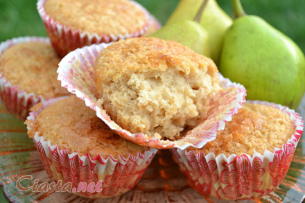Przygotować dwie miski. Do jednej wsypać suche składniki: mąkę, proszek do pieczenia, przyprawę do piernika, cukier biały drobny i cukier brązowy, wszystko wymieszać łyżką. W drugiej misce wymieszać mokre składniki: jajka, śmietanę, olej i miód. Wsypać suche składniki do mokrych i wymieszać łyżką. Gruszki zmiksować blenderem na purée i dodać do ciasta, energicznie i szybko wymieszać (bez miksowania mikserem).