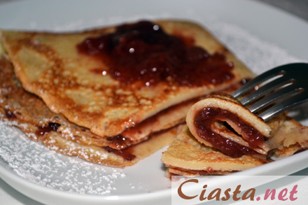 Naleśniki układać na dużym talerzu i przykryć od razu drugim talerzem, aby nie obsychały boki naleśników. Usmażone naleśniki (jeszcze ciepłe) przekładać dżemem truskawkowym, posypać cukrem pudrem i od razu podawać. Jeśli naleśniki usmażymy trochę wcześniej i są już zimne to należy je przed posmarowaniem dżemem podgrzać na patelni z bardzo małą ilością oleju lub bez (w zależności od patelni na jakiej będziemy podgrzewać naleśniki). |