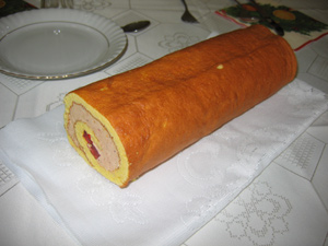 Żółtka utrzeć z cukrem dodając ocet. Na żółtka wyłożyć ubitą pianę z białek i lekko wymieszać. Następnie dodać mąkę z proszkiem do pieczenia, wymieszać. Masę wyłożyć na wcześniej przygotowaną blachę, wyrównać i wstawić do średnio nagrzanego piekarnika. Piec 15 - 20 minut w temperaturze 180 stopni C. Po wyjęciu zwinąć (ciasto musi być jeszcze gorące) i owinąć w ściereczkę. Po wystygnięciu przełożyć masą i galaretką. Zwinąć. |